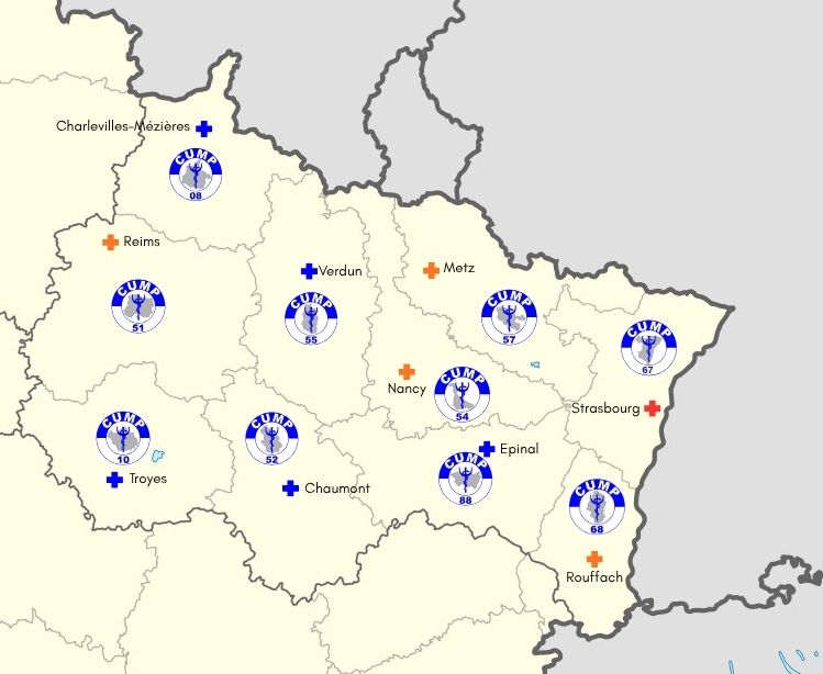 Chaque territoire dispose d’un maillage adapté : dans le Grand Est, le dispositif comprend des CUMP départementales (croix bleue), des CUMP renforcées (croix orange) ainsi qu’une CUMP régionale basée à Strasbourg (croix rouge).